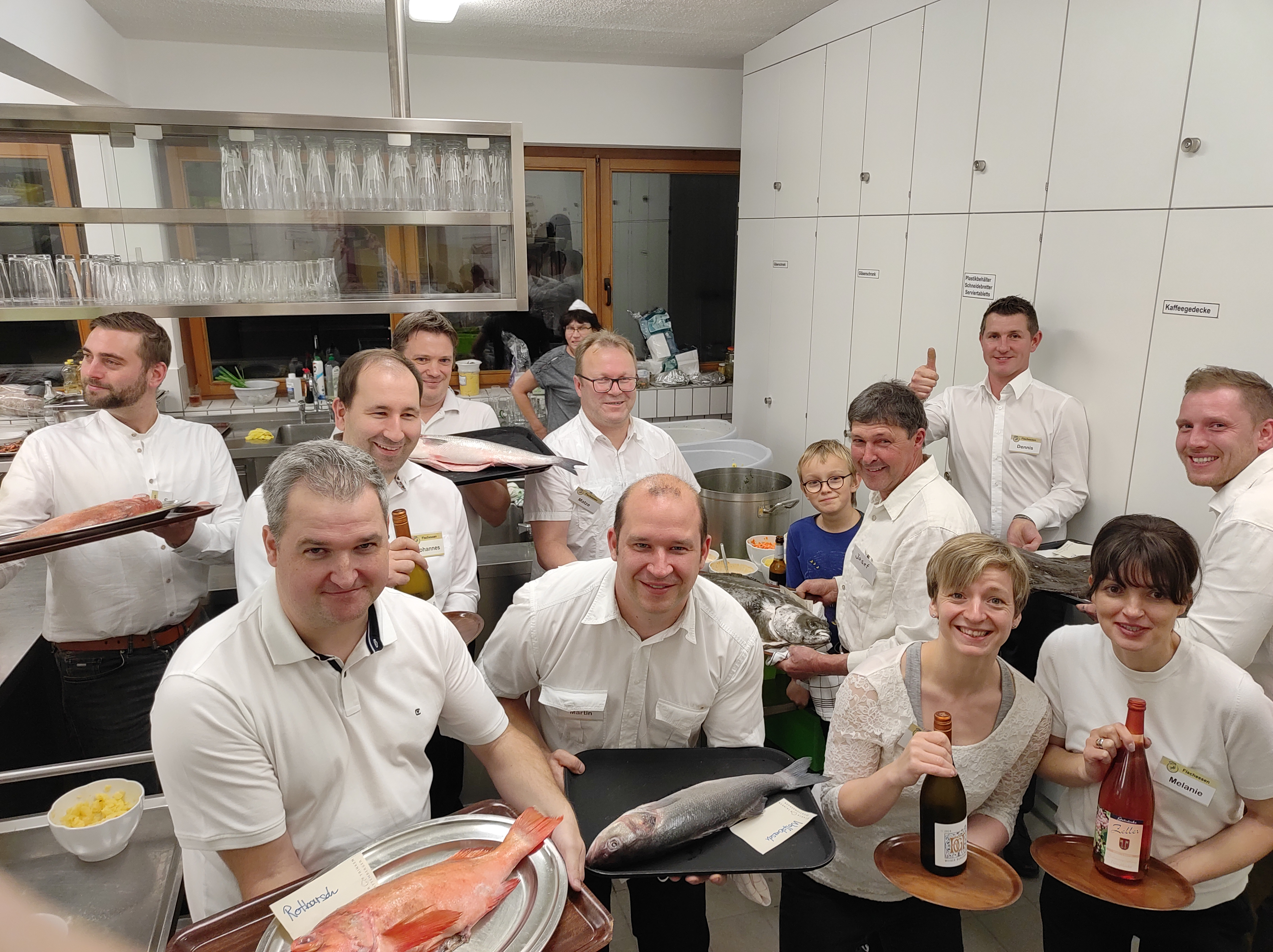 Wir starten mit den warmen Gerichten (Speisefolge s.u.), danach kommt ein kleines Rahmenprogramm mit der immer wieder beliebten Fischtombola. Abschluss des offiziellen Programms bildet die Eröffnung des kalten Buffets.